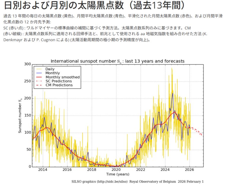 | SILSOデーター 太陽黒点数グラフ 過去13年 ベルギー王立天文台 ブリュッセル より引用 https://www.sidc.be/SILSO/home 左はSolar Influences Data Analysis Center へのリンクです グラフデーター引用元です 太陽黒点の直近のデーターを確認される方はこちらをご覧ください 2026年2月1日 ベルギー王立天文台 公開データー 2026年2月1日 ベルギー王立天文台 公開データー 過去6サイクルの推移グラフ 2026年2月1日 ベルギー王立天文台 公開データーより引用 |