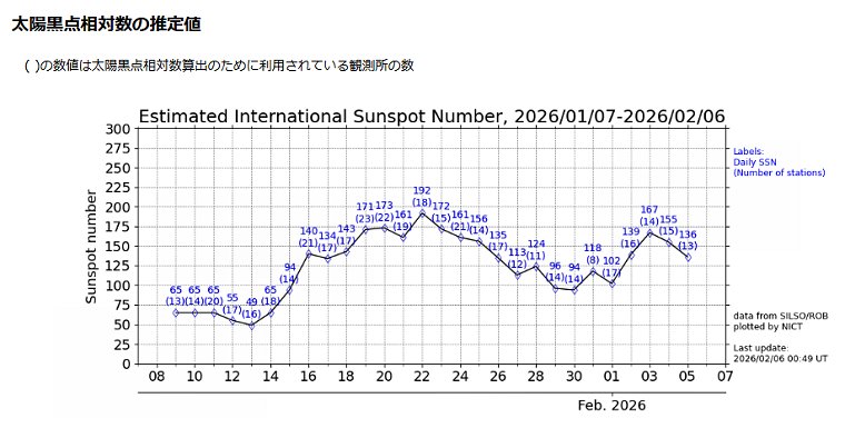 | 情報通信研究機構宇宙天気予報センターの太陽黒点のページです http://swc.nict.go.jp/trend/sunspot.html 国立研究開発法人 情報通信研究機構 電磁波研究所 宇宙環境研究室が運営するWebサイトです 太陽面や画面のような黒点数、その他多くの情報が見られます Webサイトで最新の状況をご確認ください このグラフデータ引用元です 1月9日~2月5日の太陽黒点数 |