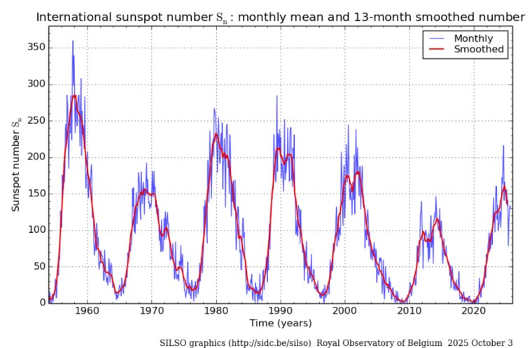 | 2025年10月3日 ベルギー王立天文台 公開データー SILSOデーター 太陽黒点数グラフ 過去13年 ベルギー王立天文台 ブリュッセル より引用 https://www.sidc.be/SILSO/home 左はSolar Influences Data Analysis Center へのリンクです グラフデーター引用元です 太陽黒点の直近のデーターを確認される方はこちらをご覧ください 2025年10月3日 ベルギー王立天文台 公開データー 過去6サイクルの推移グラフ |