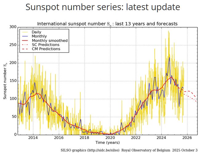 2025年10月3日 ベルギー王立天文台 公開データー SILSOデーター 太陽黒点数グラフ 過去13年 ベルギー王立天文台 ブリュッセル より引用 https://www.sidc.be/SILSO/home 左はSolar Influences Data Analysis Center へのリンクです グラフデーター引用元です 太陽黒点の直近のデーターを確認される方はこちらをご覧ください ![]() 2025年10月3日 ベルギー王立天文台 公開データー 過去6サイクルの推移グラフ ![]() |
