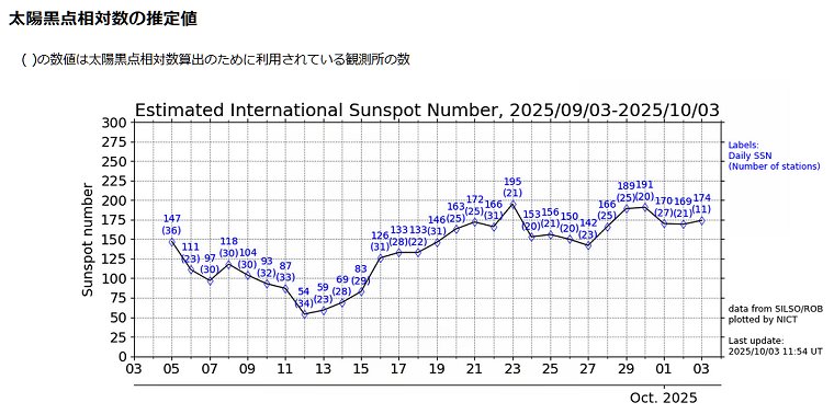 情報通信研究機構宇宙天気予報センターの太陽黒点のページです http://swc.nict.go.jp/trend/sunspot.html 国立研究開発法人 情報通信研究機構 電磁波研究所 宇宙環境研究室が運営するWebサイトです 太陽面や画面のような黒点数、その他多くの情報が見られます Webサイトで最新の状況をご確認ください このグラフデータ引用元です 9月5日~10月3日の太陽黒点数 ![]() |