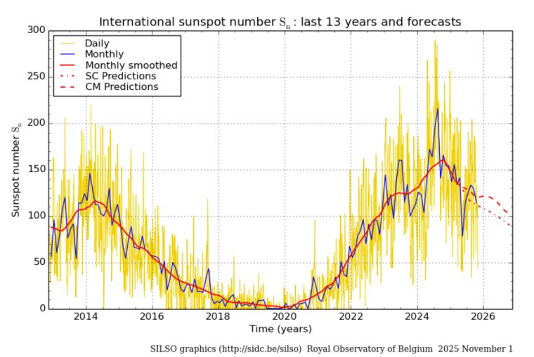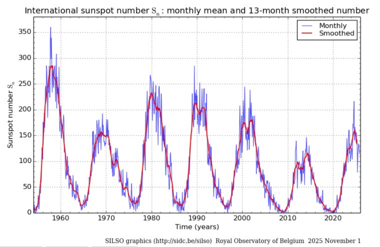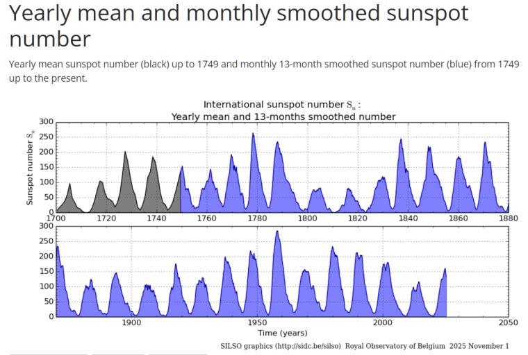 | 2025年11月1日 ベルギー王立天文台 公開データー SILSOデーター 太陽黒点数グラフ 過去13年 ベルギー王立天文台 ブリュッセル より引用 https://www.sidc.be/SILSO/home 左はSolar Influences Data Analysis Center へのリンクです グラフデーター引用元です 太陽黒点の直近のデーターを確認される方はこちらをご覧ください 2025年11月1日 ベルギー王立天文台 公開データー 過去6サイクルの推移グラフ 2025年11月1日 ベルギー王立天文台 公開データーより引用 1749年から現在までの年間平均黒点数です |