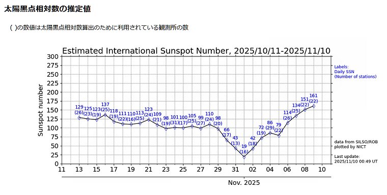 | 情報通信研究機構宇宙天気予報センターの太陽黒点のページです http://swc.nict.go.jp/trend/sunspot.html 国立研究開発法人 情報通信研究機構 電磁波研究所 宇宙環境研究室が運営するWebサイトです 太陽面や画面のような黒点数、その他多くの情報が見られます Webサイトで最新の状況をご確認ください このグラフデータ引用元です 10月13日~11月9日の太陽黒点数 |